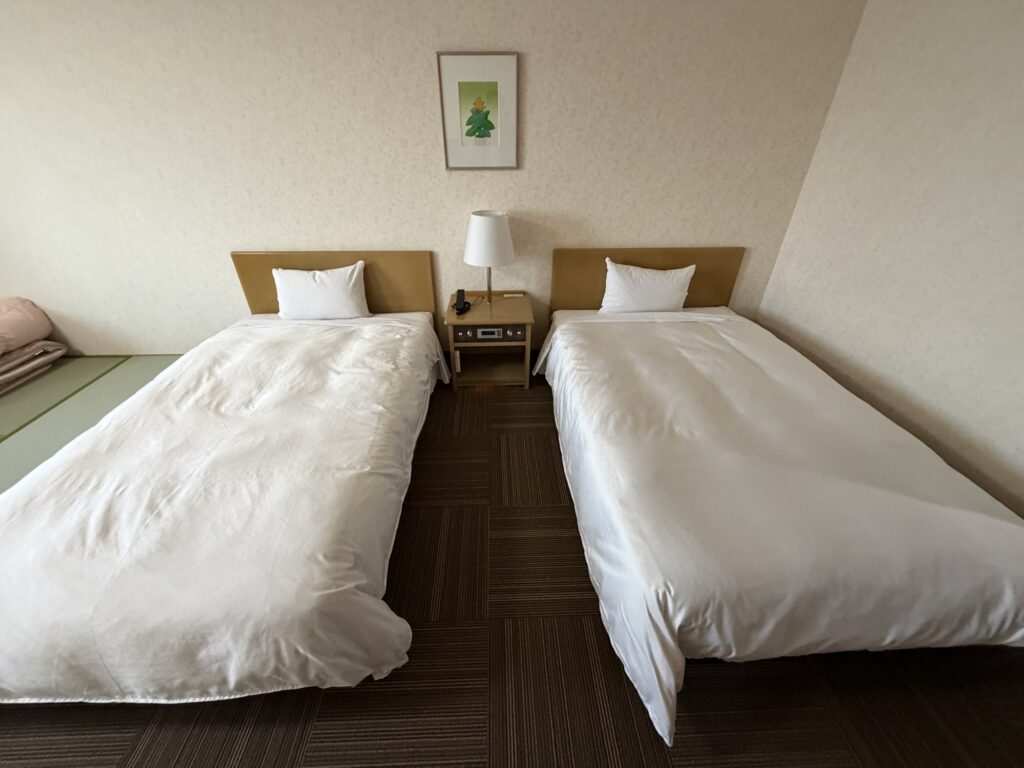 シングルサイズのベッドが2台並んでいますが、ベッド同士の間隔がしっかり確保されているので、窮屈さは全く感じません。
