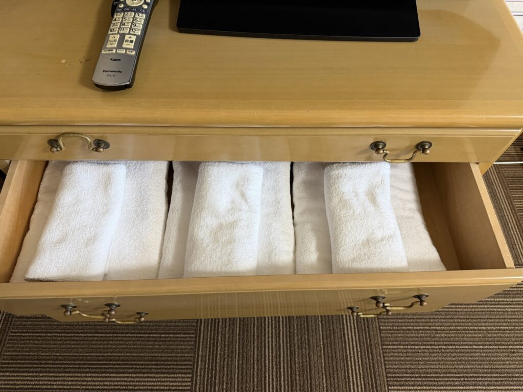 テレビ下にある引き出しに人数分のバスタオルとフェイスタオルを持っていく必要があります。