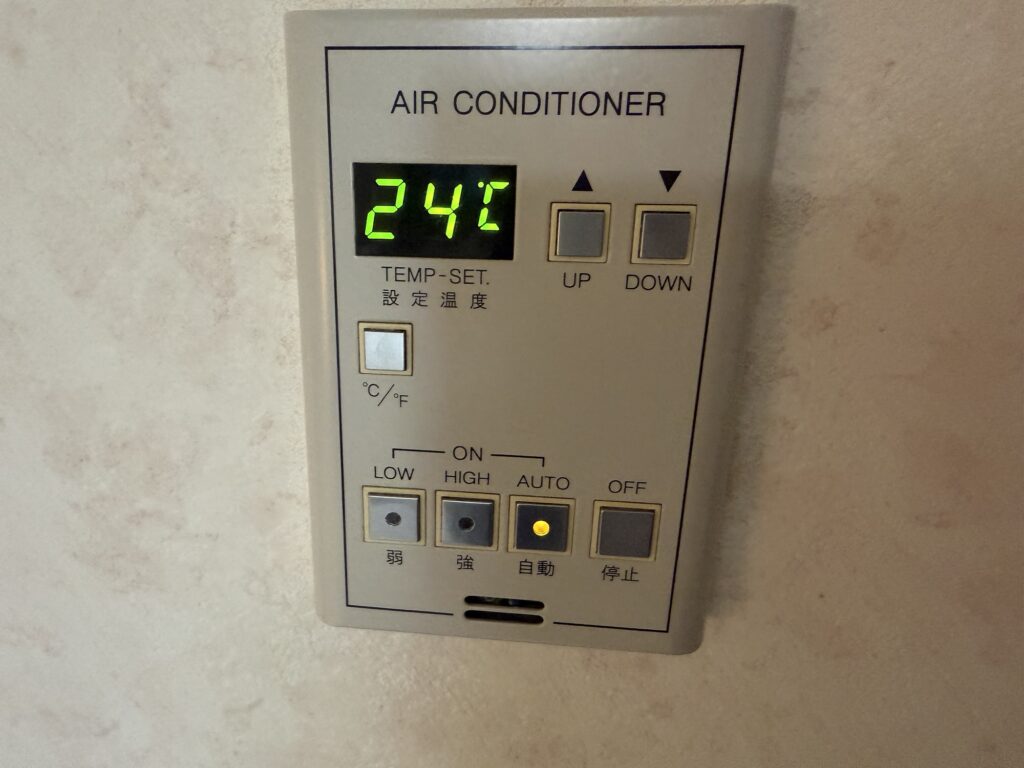 温度や風量の調節はパネルで可能ですが、「冷房・暖房」の切り替えはホテル側で一括設定されています。