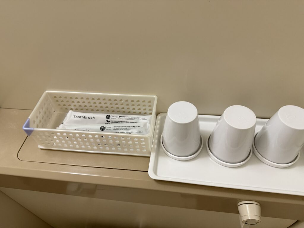 トイレの上部には、歯ブラシセットやコップが人数分、トレイにまとめられて用意されています。