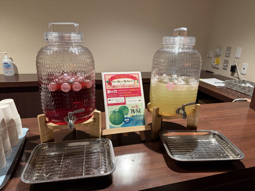 お風呂上がりまで抜かりないのがメルキュールの凄いところ。 脱衣所近くの湯上がりラウンジには、冷たい**「ビネガードリンク」**が用意されています。