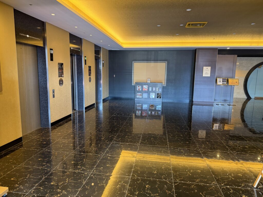 ロビーから続くピカピカの大理石調の床に、温かみのあるゴールドの壁面が反射して、空間全体がキラキラと輝いています。