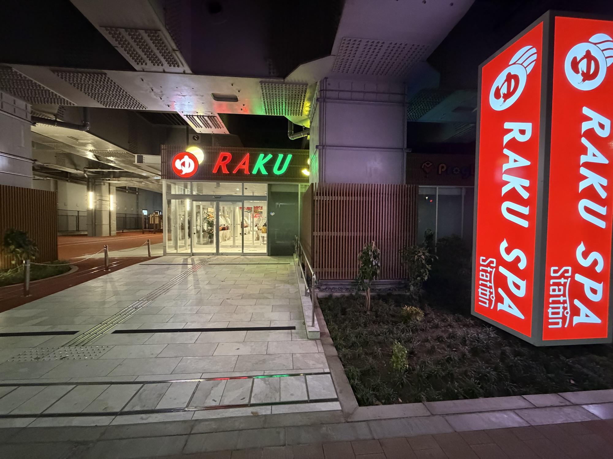 武蔵小金井駅の東側に入り口が用意されていて、ギラついたRAKUSPAのカラフルなネオンが目印。