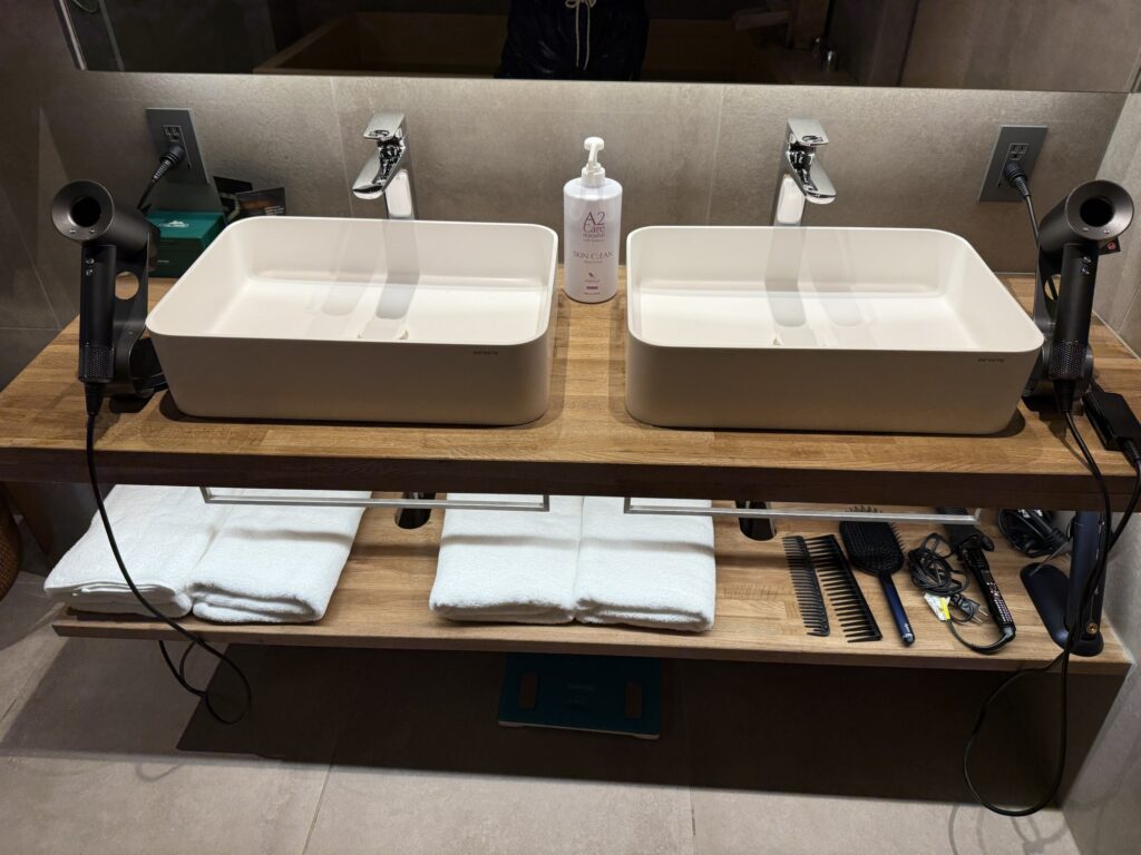 洗面台は清潔感があって気持ちがよい。ドライヤーも2台完備でDyson製。