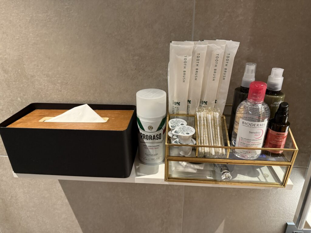マウスウォッシュに化粧水に歯ブラシセットにアメニティグッズも充実。