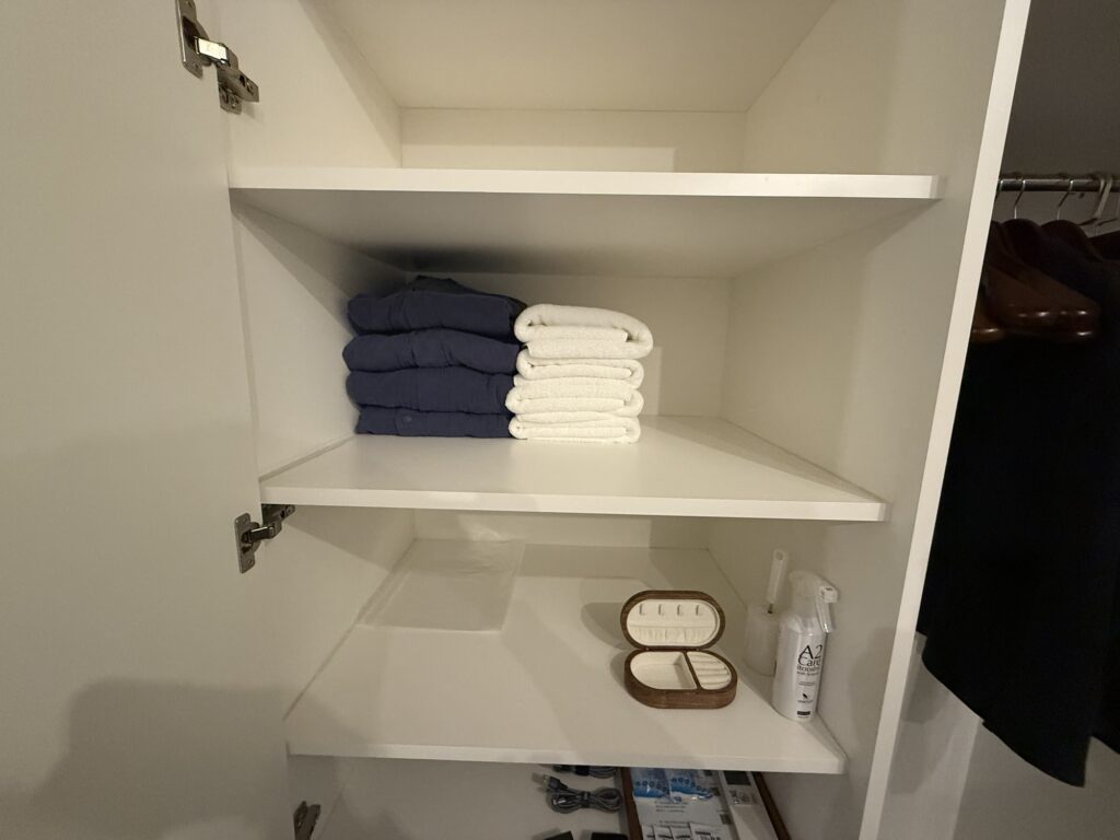 マンションの収納と同じだが、かなり大きめで、人数分のガウン、タオルセット。