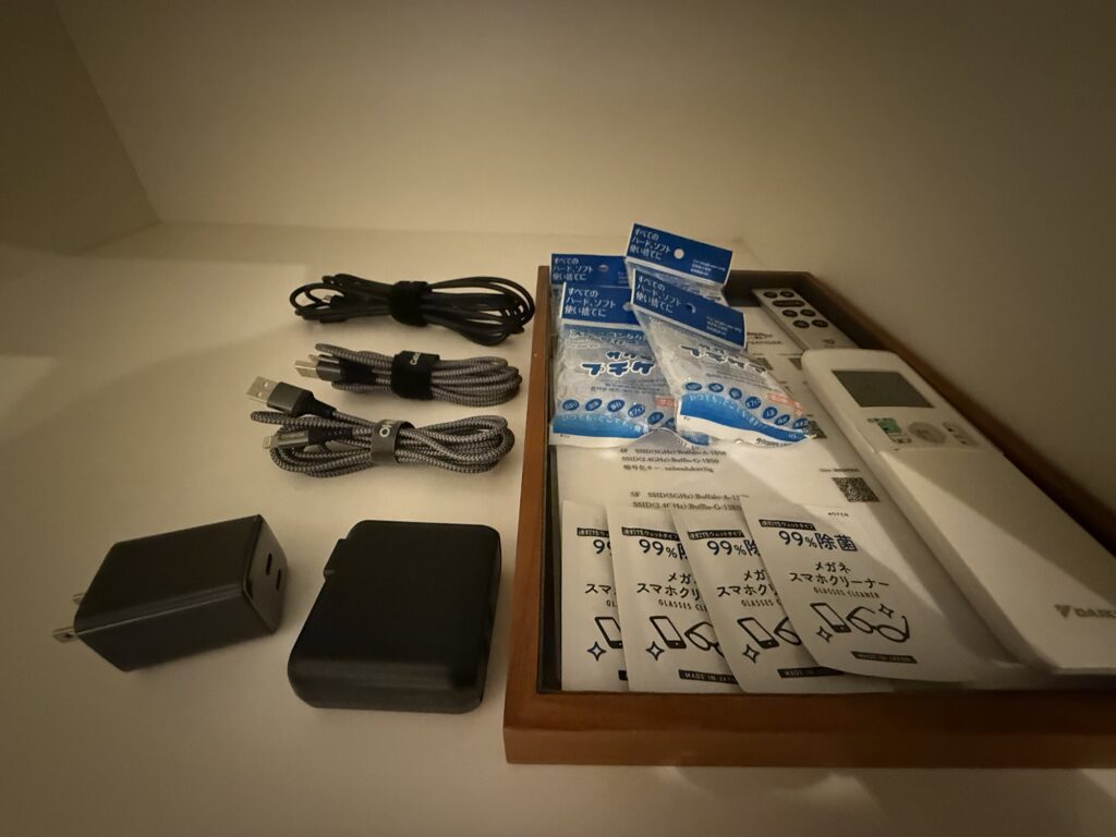 Ankerの充電ケーブルなどのグッズも充実している。眼鏡スマホクリーナーも人数分 笑。